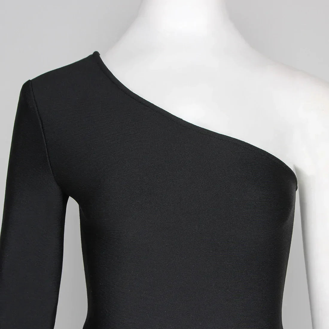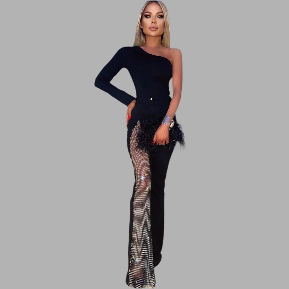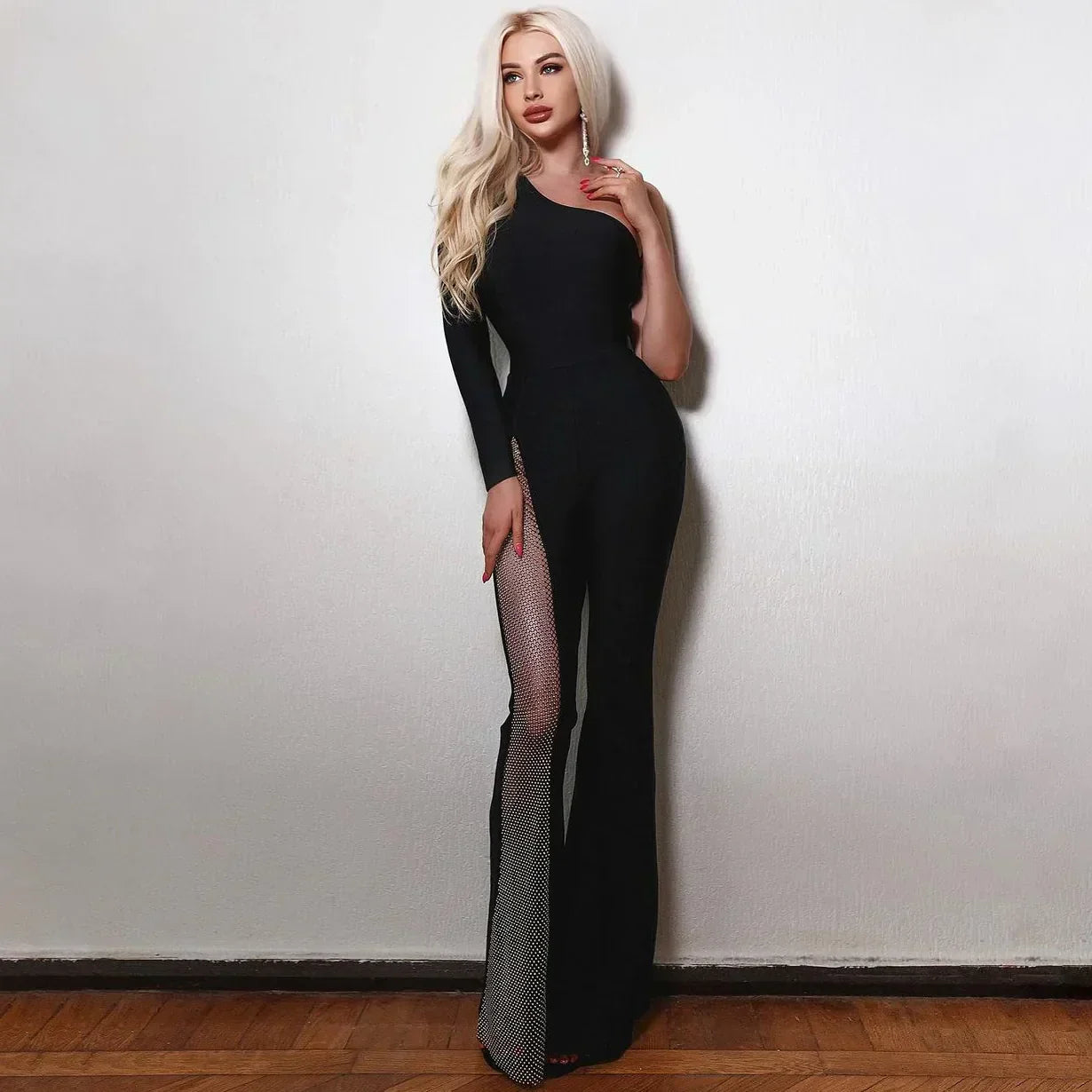 Schwarzer Ein-Schulter Asymmetrischer Strass-Bandagen-Jumpsuit