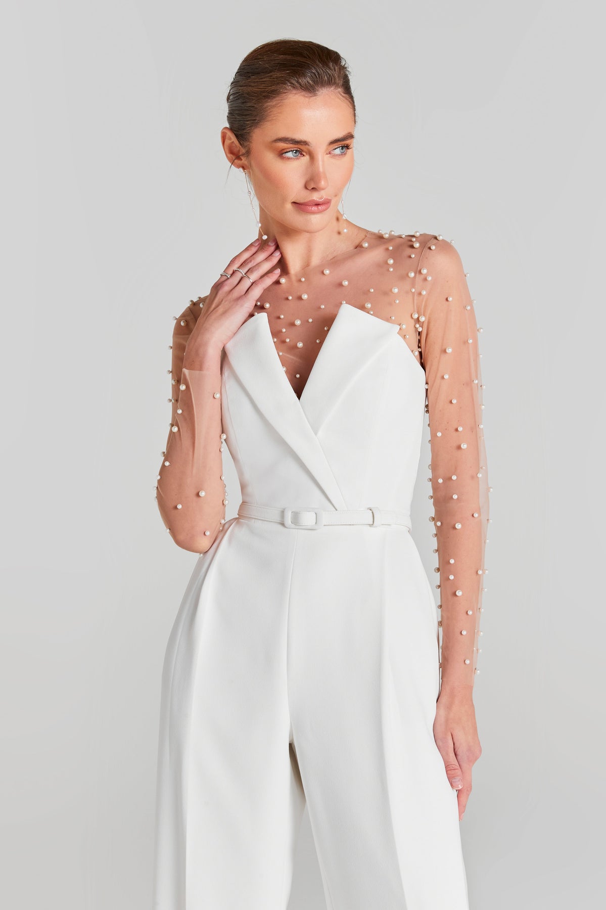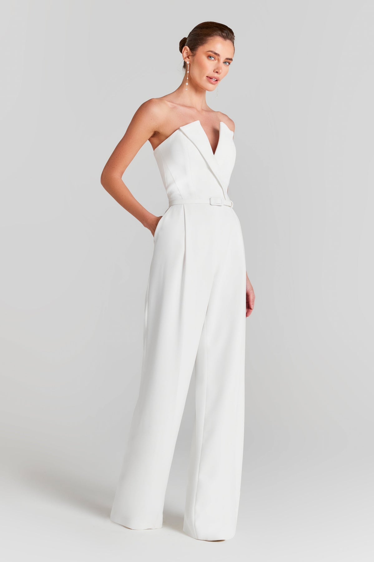 VANESSA ist ein Jumpsuit im Smoking-Stil aus exklusiv entworfenem Crêpe mit tiefem V-Ausschnitt und strukturiertem Revers über der Brust, einem Korsett-Oberteil, weiten, langen Hosen mit Beinfalten und silhouettenbetonenden Nahtdetails. und funktionellen Leistentaschen.