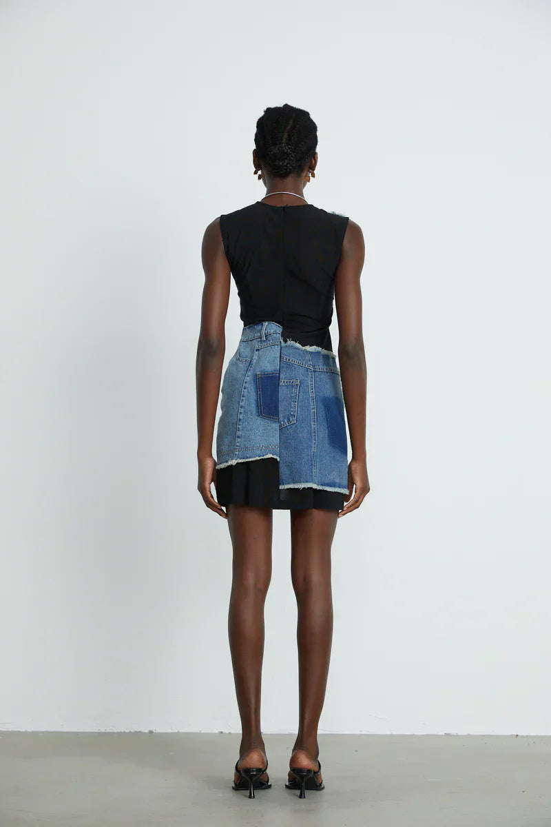 Lana- Denim Patchwork ärmelloses Kleid