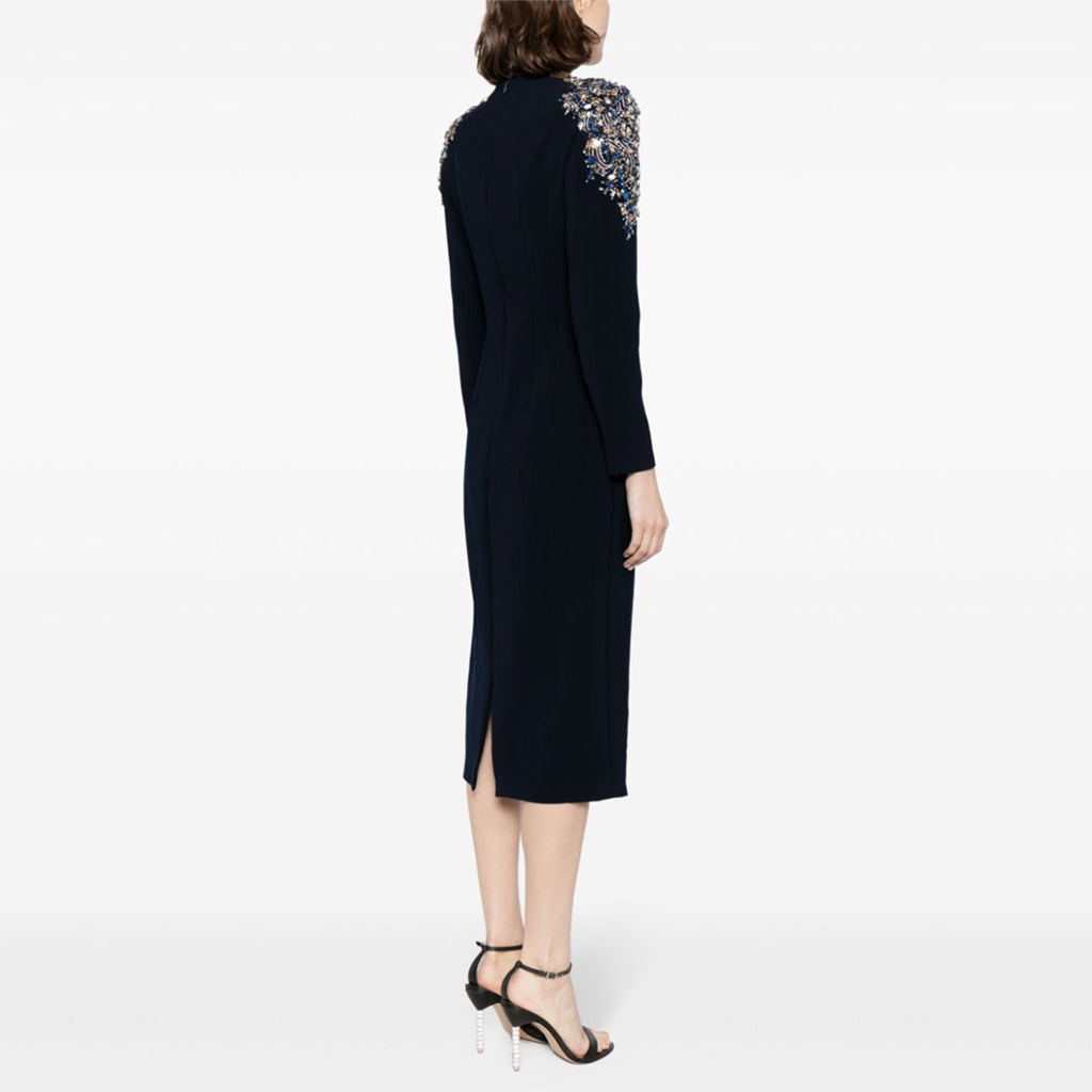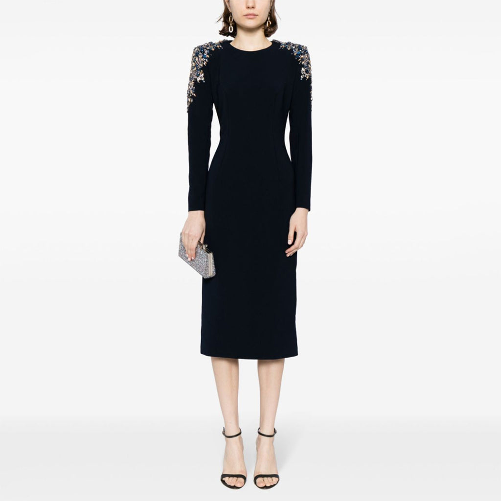 Bekämpfen Sie die winterliche Kälte und sehen Sie dabei fabulos aus in einem Cocktailkleid mit langen Ärmeln. Unser Designer-Kleid in Schwarz besteht aus einer Polyester-Mischung und verfügt über einen runden Halsausschnitt, gepolsterte Schultern, lange Ärmel mit Reißverschlussbündchen und einen versteckten Reißverschluss auf der Rückseite. Funkelnde, farbenfrohe Strasssteine zieren die Schultern dieses prachtvollen Kristallkleides, das dank der Prinzessnähte in einer figurbetonten Silhouette sitzt. Dieses Midi-Diamantkleid verspricht Ihnen einen angemessenen und eleganten Auftritt bei jedem Anlass und ist in dieser Saison ein unverzichtbares Basic.